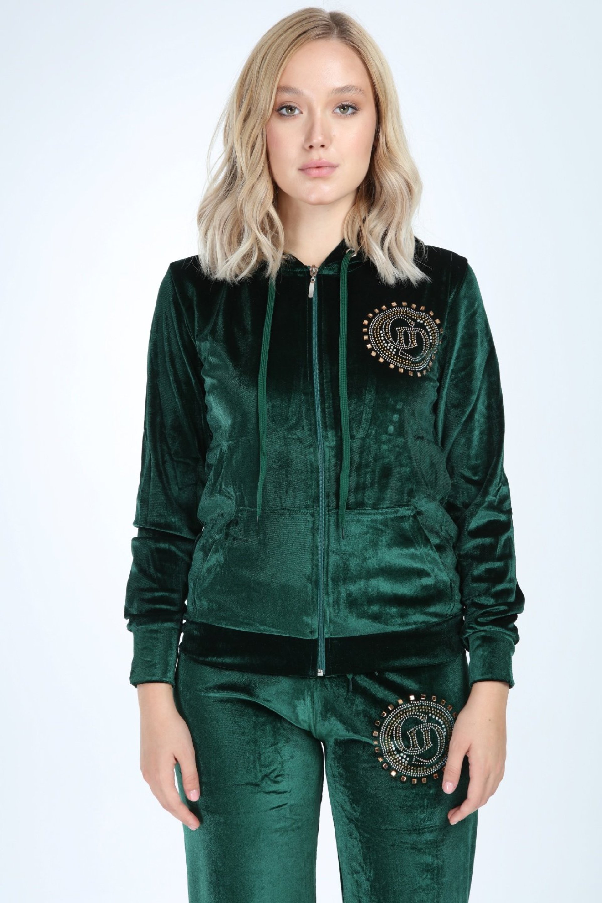 Bol Paçalı Zümrüt Yeşil Bayan Kadife Takım