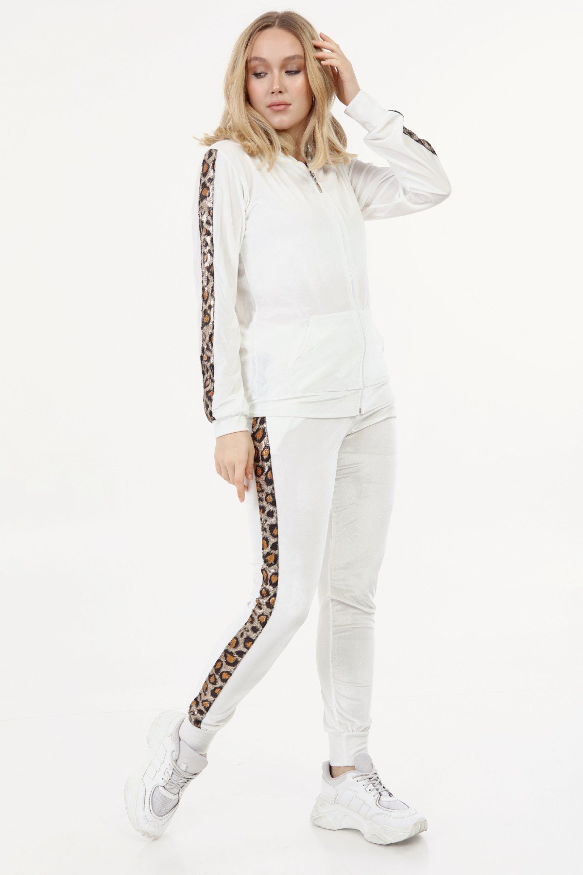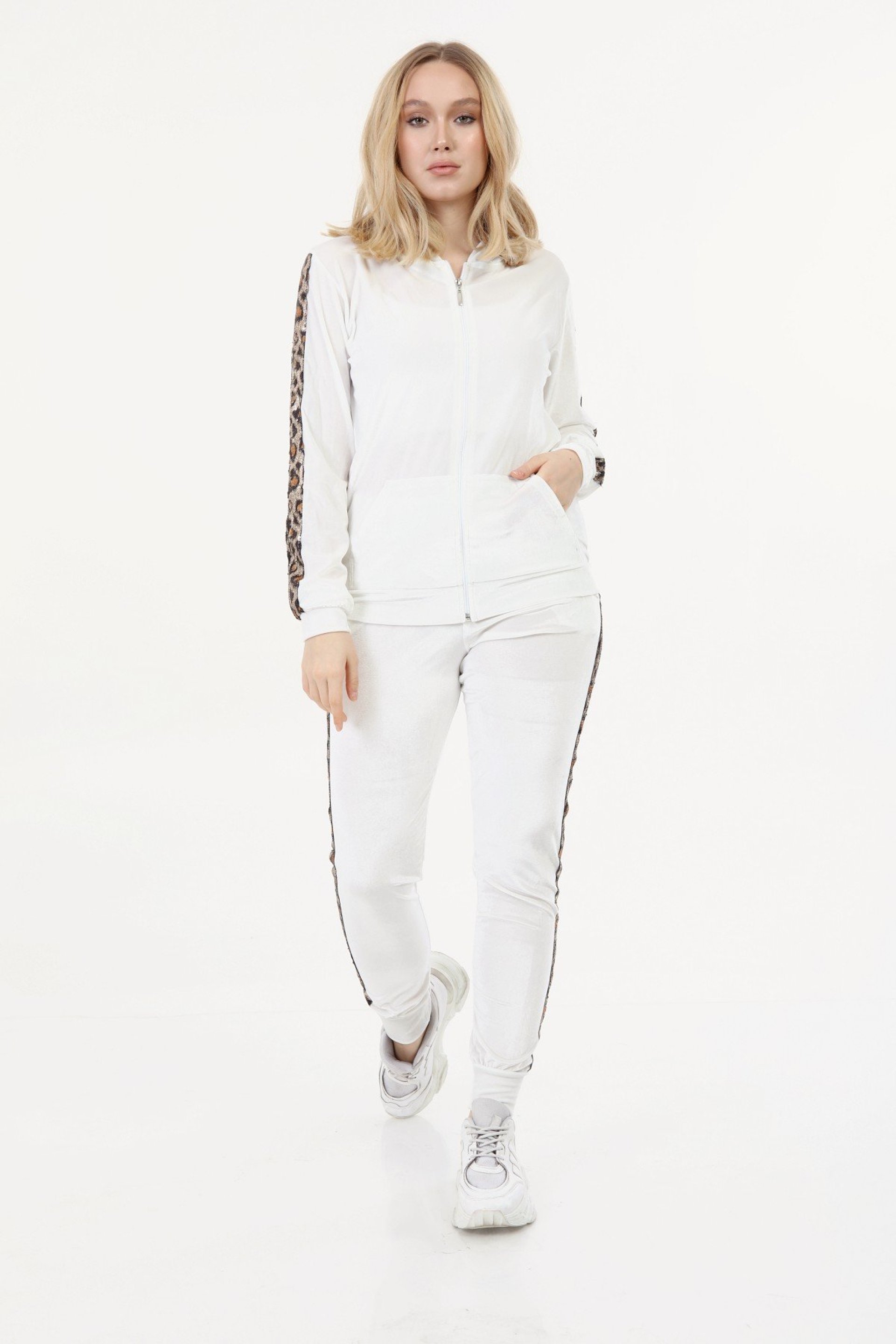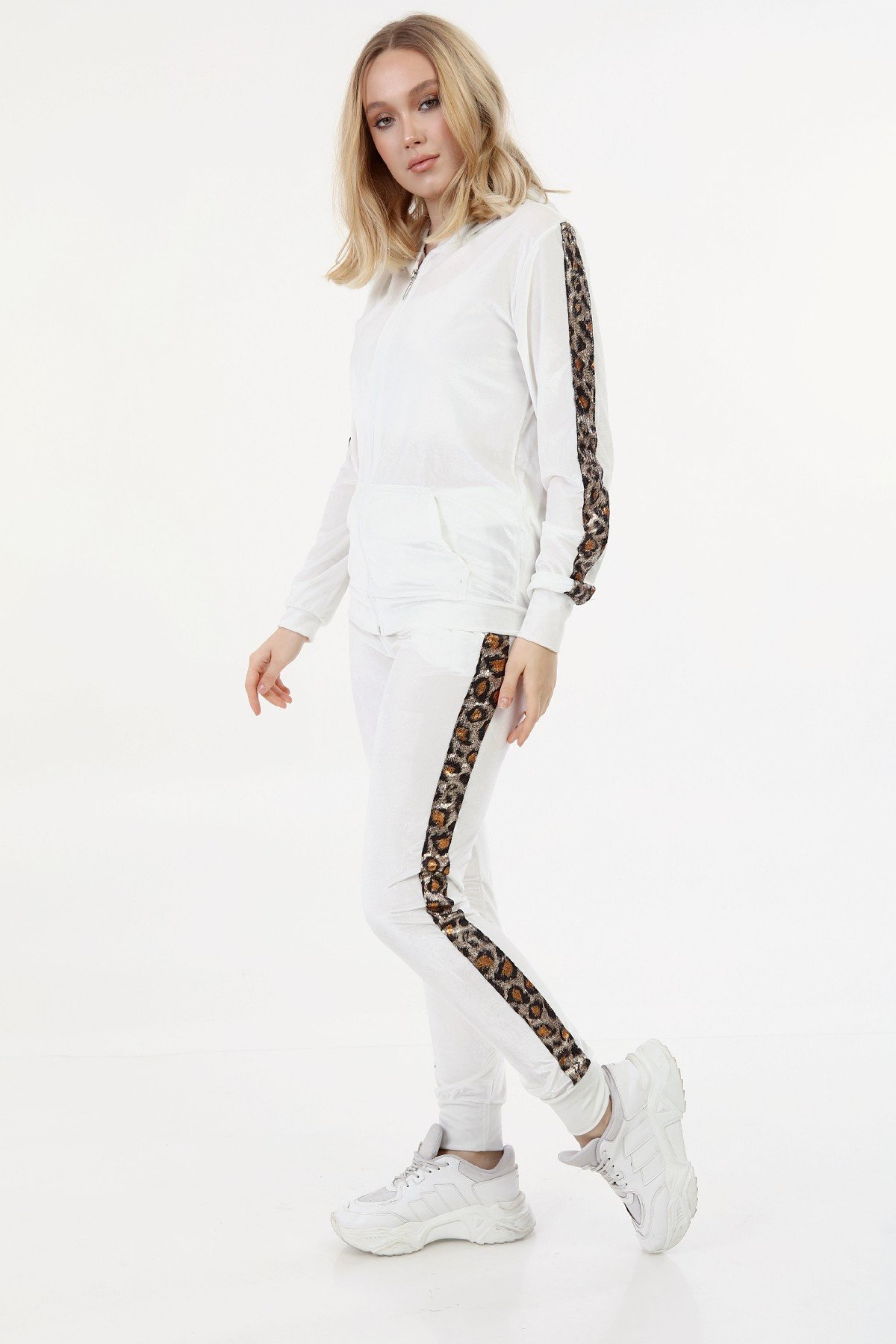 Leoparlı Beyaz Bayan Kadife Takım