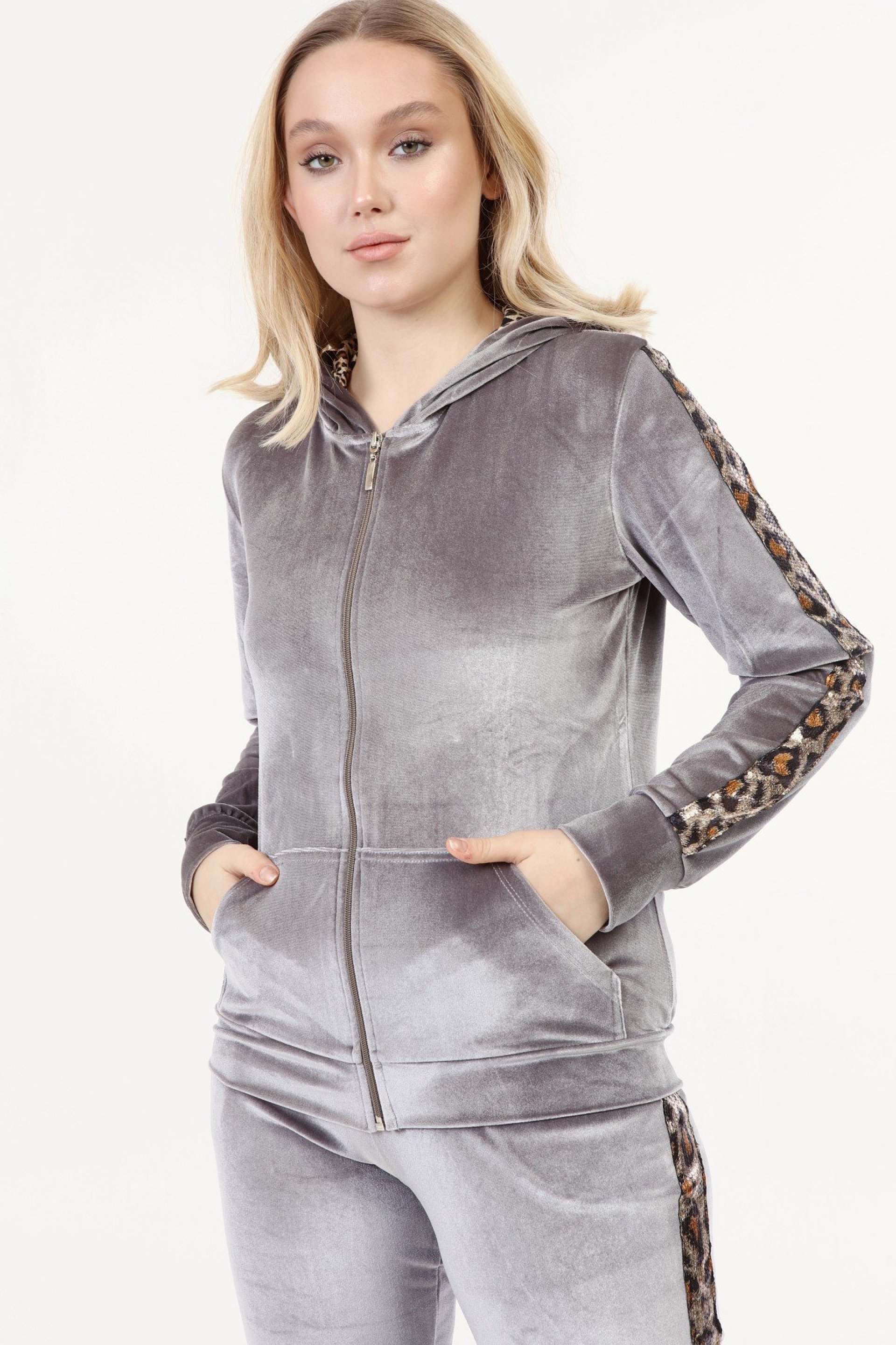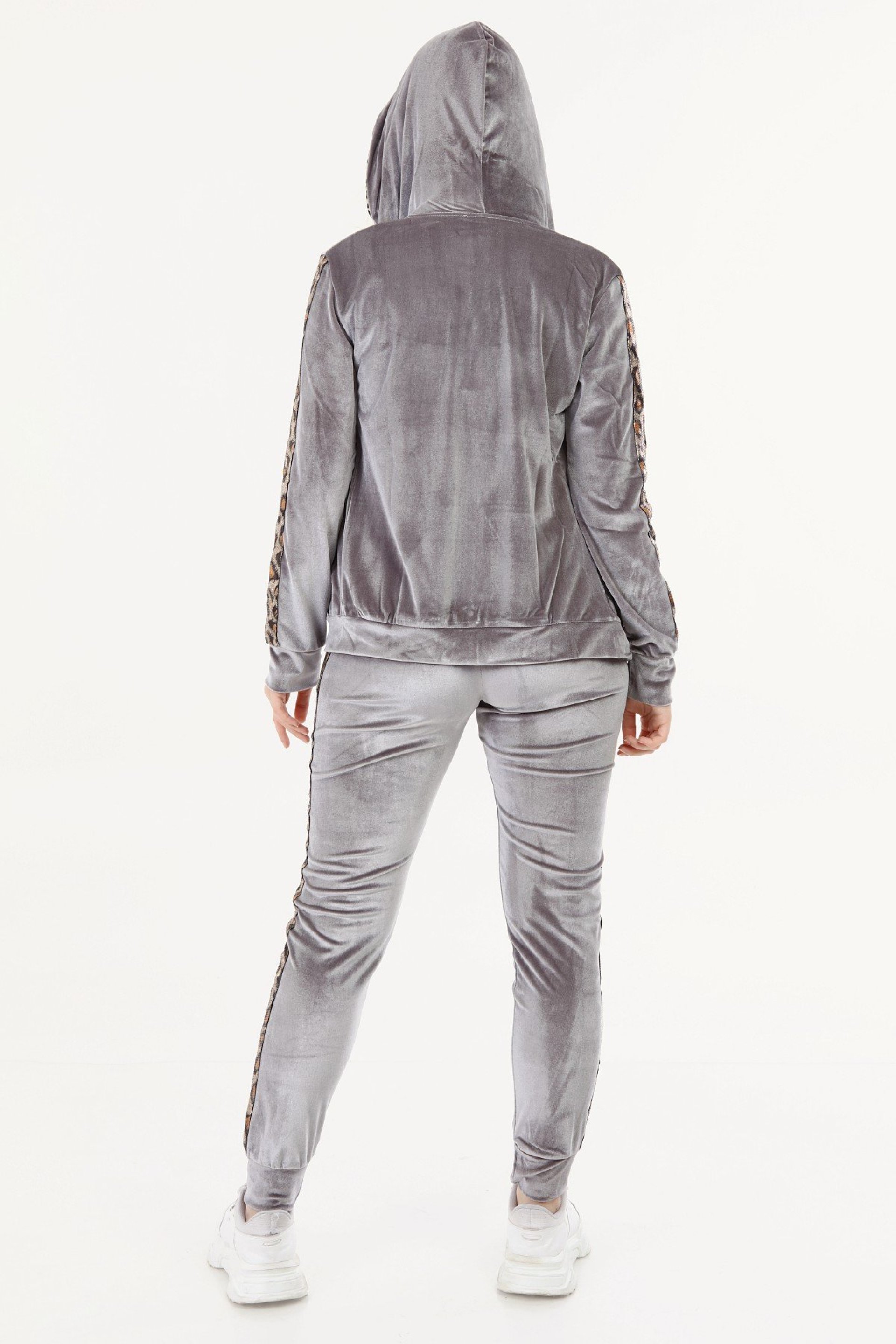 Leoparlı Gri Bayan Kadife Takım
