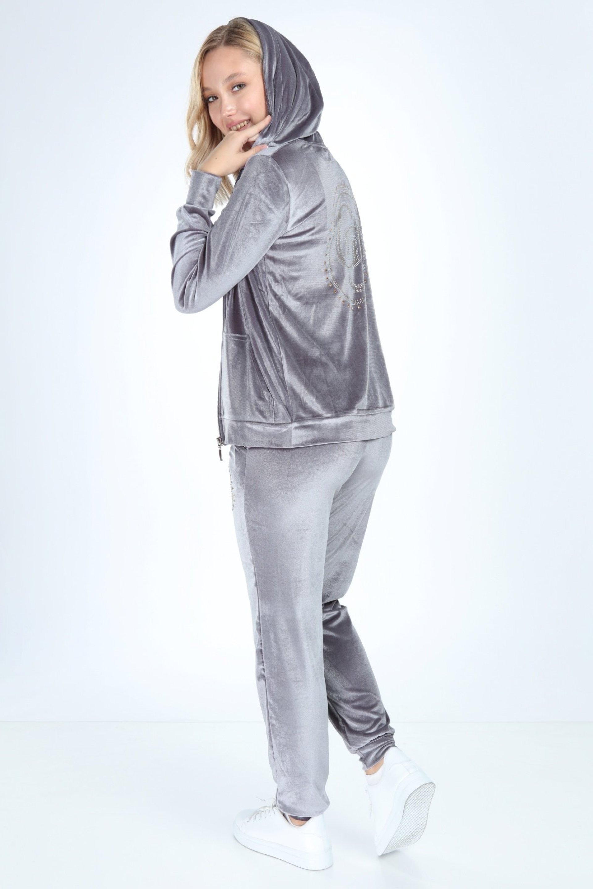 Paça Lastik Gri Bayan Kadife Takım
